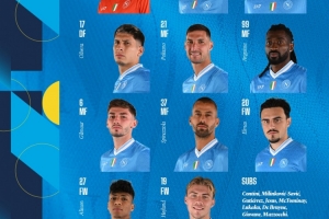 那不勒斯首发:1-梅雷特;31-别克马、4-布翁乔尔诺、17-奥利维拉;21-波利塔诺、99-安古伊萨、6-吉尔莫、37-斯皮纳佐拉、20-埃尔马斯;27-阿利松·桑托斯、19-霍伊伦