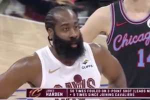 骑士VS公牛,哈登首节两次打成3+1,转播方晒统计:哈登本赛季50次造成三分球犯规领跑全联盟,加入骑士之后已经9次。