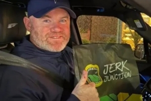 鲁尼在社交媒体展示了他从威尔姆斯洛的Jerk Junction餐厅买的外卖,这位曼联历史最佳射手在车里拿着食物包装袋,咧嘴笑着并对镜头竖起大拇指。